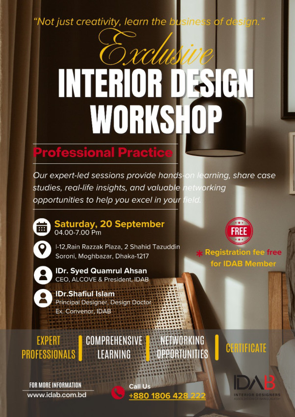 “Not just creativity, learn the business of design.” 🏛 Exclusive Interior Design Workshop on Professional Practice 🎯 Workshop Highlights * Industry Insights: Current market trends, opportunities, and challenges in the interior design sector. * Professional Ethics & Standards: Responsibilities and professional conduct as a designer. * Client Handling & Communication: Effective communication and expectation management with clients. * Legal & Contractual Knowledge: Project agreements, design copyrights, and legal aspects. * Portfolio Development: Techniques to professionally present your work. 👨🎓 Who Should Attend? * Emerging professional designers * Individuals planning to start a design practice * Architecture and interior design students * Entrepreneurs and freelance designers 📌 Why Join This Workshop? ✅ Real-life experiences shared by industry experts ✅ Certificate of Participation ✅ Networking opportunities 📅 Event Details Date: Saturday, 20 September Time: 04.00-7.00 Pm Venue: L-12,Rain Razzak Plaza, 2 Shahid Tazuddin Soroni, Moghbazar, Dhaka-1217 Registration Fee: 500/- Taka/ Per Person.( Free for IDAB Member) Payment Option (B-Kash Merchant):01806-428220 Registration Link: https://forms.gle/WsaFNRFHj4pHGR3a8 Google Docs IDAB Professional Practice Workshop Registration Date: Saturday, 20 September Time: 04.00-7.00 Pm